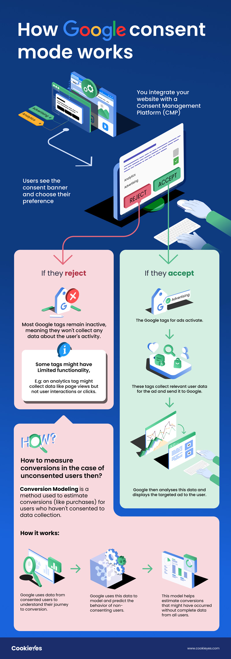 It checks what each visitor is happy with and adjusts how your website tracks them. If they say yes, great, everything works as normal. If they say no, that is fine too. Google switches to privacy friendly signals and modelling so you still have some understanding of what is happening on your site, without collecting personal data. If they ignore the banner, you get the bare minimum until they make a choice.